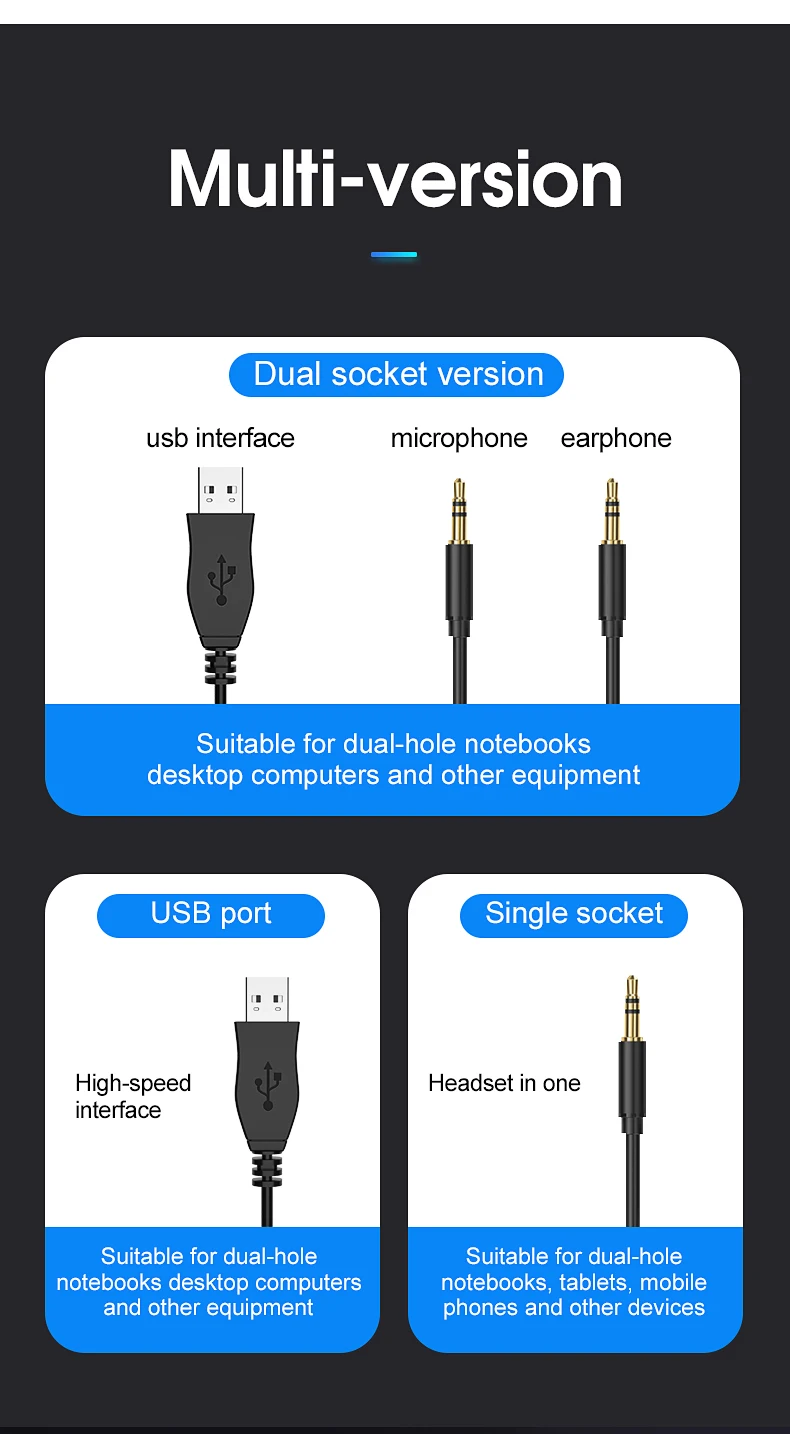 2. nenhum som surround 7.1: conector de 2*3.5mm, 1deles para som, 1 deles para microfone. Ele também tem uma porta usb para alimentar as luzes led.